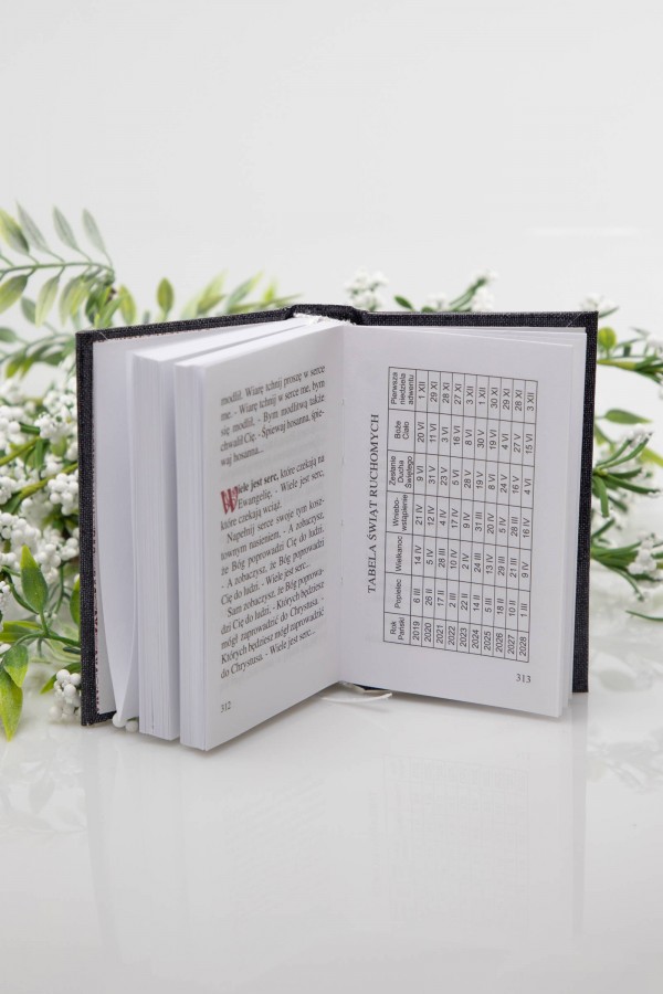 - zawiera kolorowe ilustracje oraz grafiki o tematyce liturgicznej w odcieniach koloru bordowego
