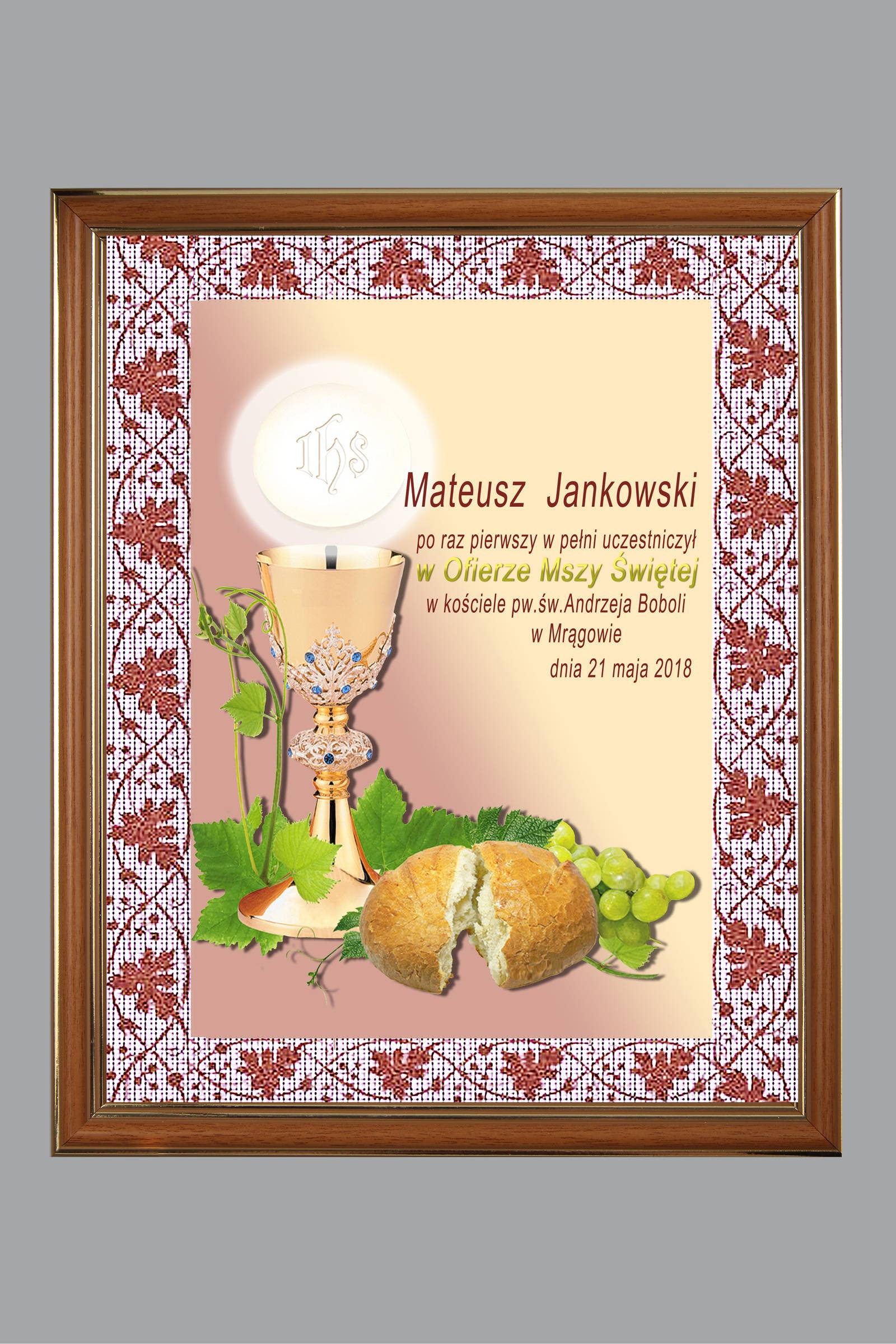 Klient otrzymuje spersonalizowaną pamiątkę z wydrukowanym imieniem i nazwiskiem dziecka oraz datą Pierwszej Komunii Świętej w zestawie z drewnianą ramką i szybką.