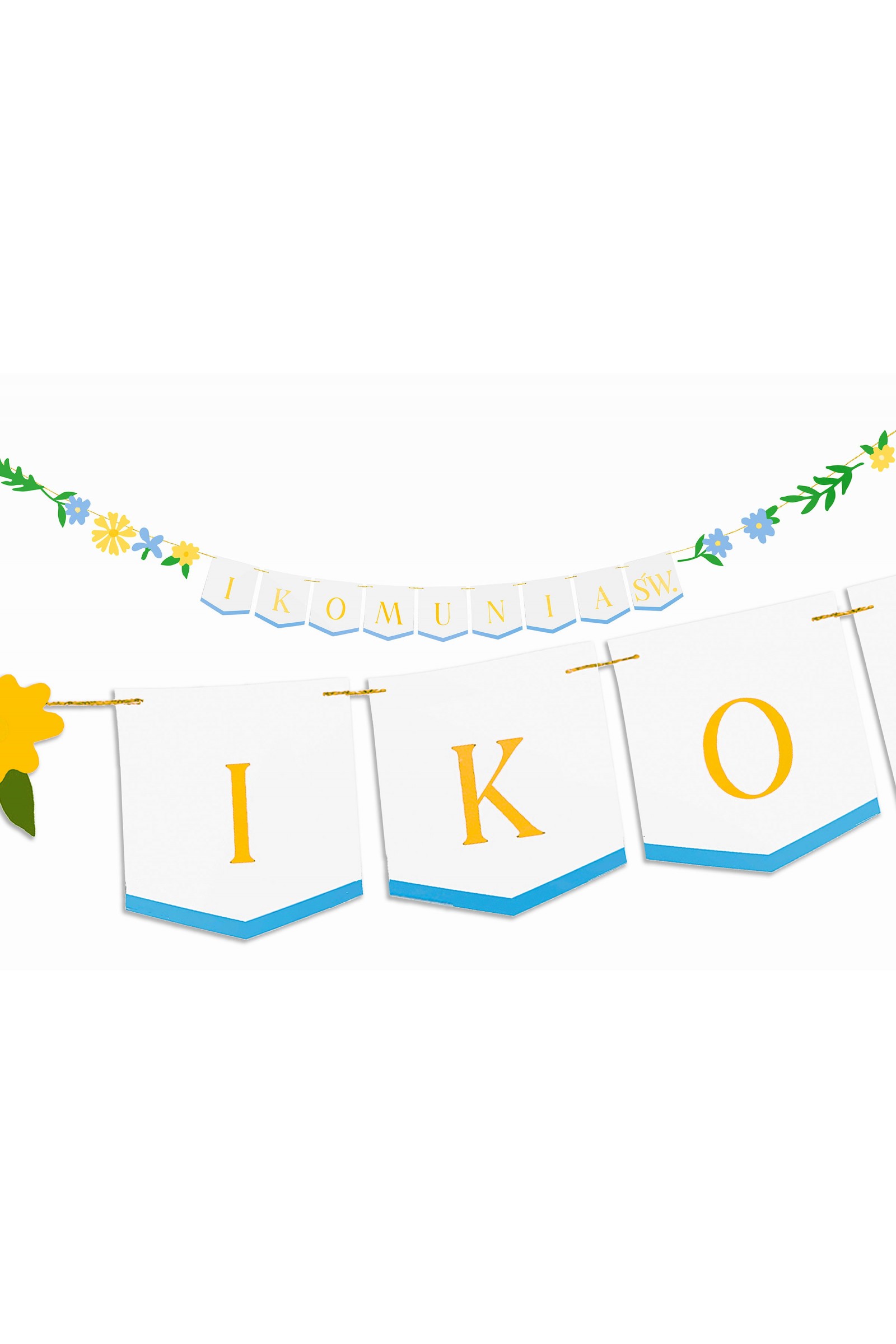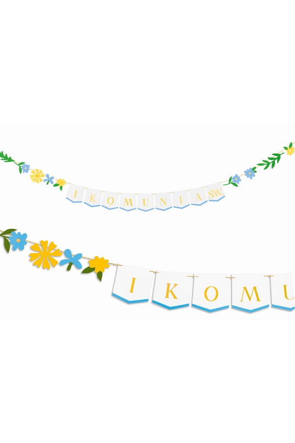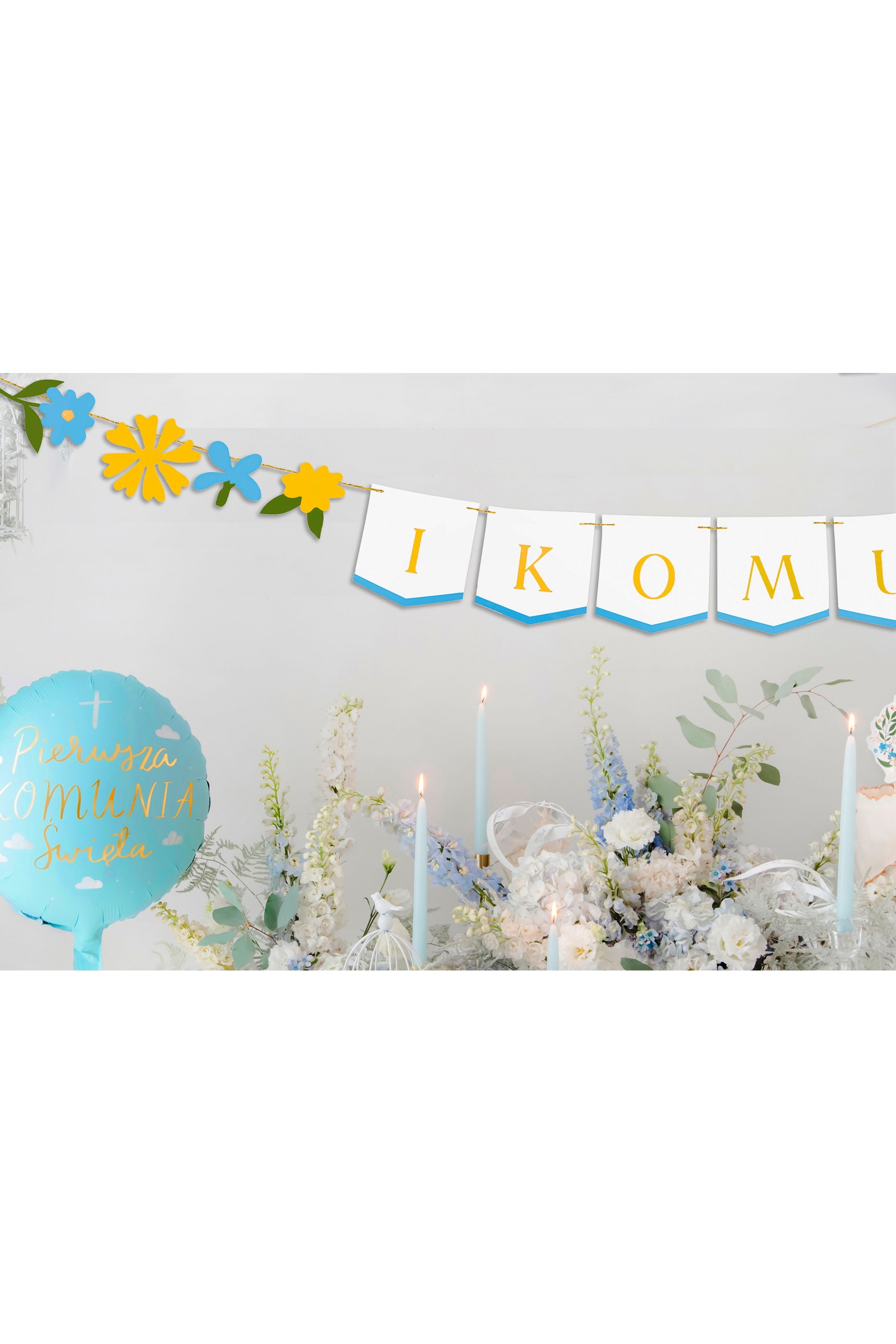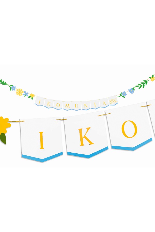 Girlanda komunijna – piękna, nowoczesna ozdoba wykonana z białego i kolorowanego papieru w kształcie proporczyków z niebieskimi brzegami, na których umieszczone są złote litery składające się na napis „I KOMUNIA ŚW”. Po obu brzegach znajdują się elementy w kształcie żółtych, niebieskich kwiatów i zielonych gałązek. Delikatna i elegancka, najmodniejsza w tym sezonie świetnie prezentuje się na dużej sali jak i w mieszkaniu podkreślając wyjątkowość uroczystości. Będzie wspaniałym uzupełnieniem dekoracji przyjęcia komunijnego Państwa Pociechy.