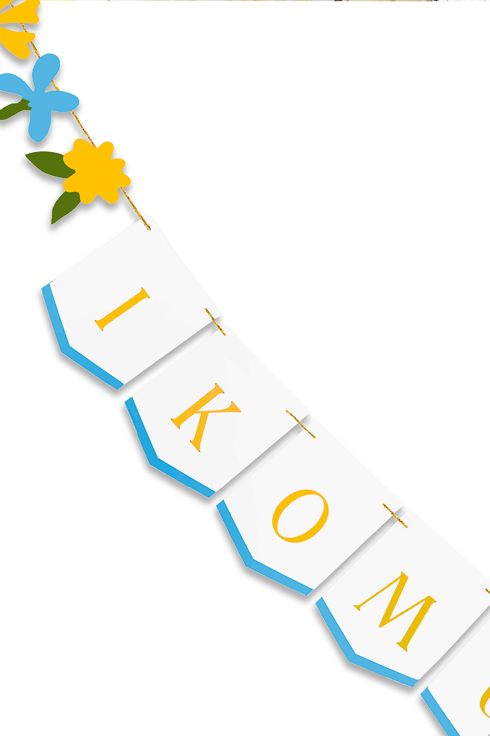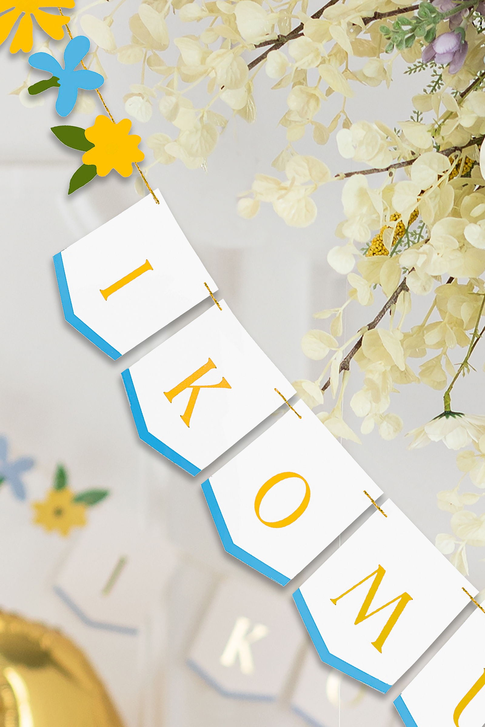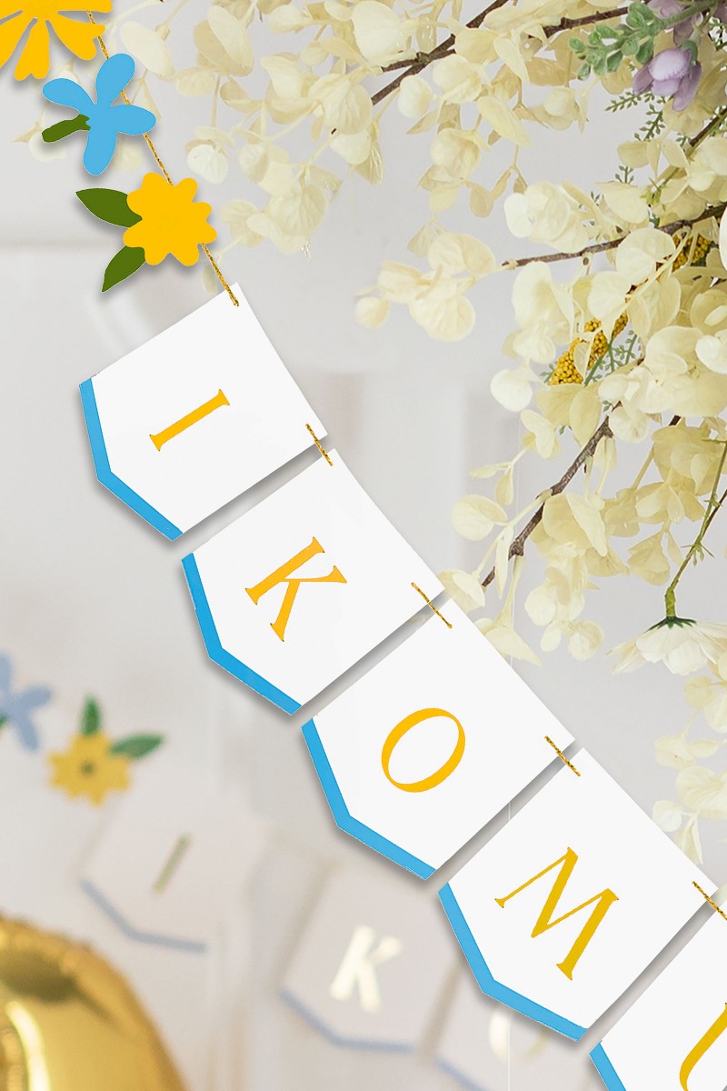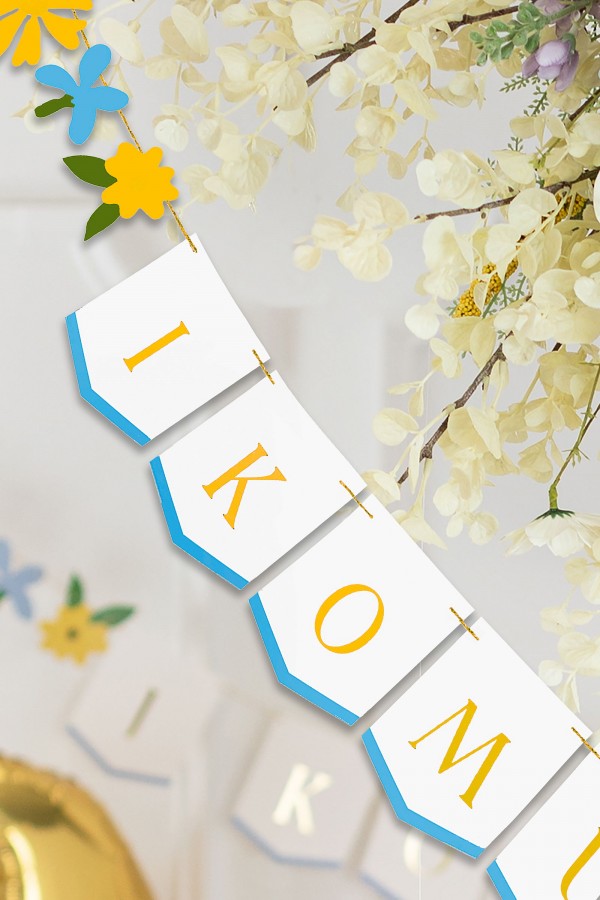 Girlanda komunijna – piękna, nowoczesna ozdoba wykonana z białego i kolorowanego papieru w kształcie proporczyków z niebieskimi brzegami, na których umieszczone są złote litery składające się na napis „I KOMUNIA ŚW”. Po obu brzegach znajdują się elementy w kształcie żółtych, niebieskich kwiatów i zielonych gałązek. Delikatna i elegancka, najmodniejsza w tym sezonie świetnie prezentuje się na dużej sali jak i w mieszkaniu podkreślając wyjątkowość uroczystości. Będzie wspaniałym uzupełnieniem dekoracji przyjęcia komunijnego Państwa Pociechy.