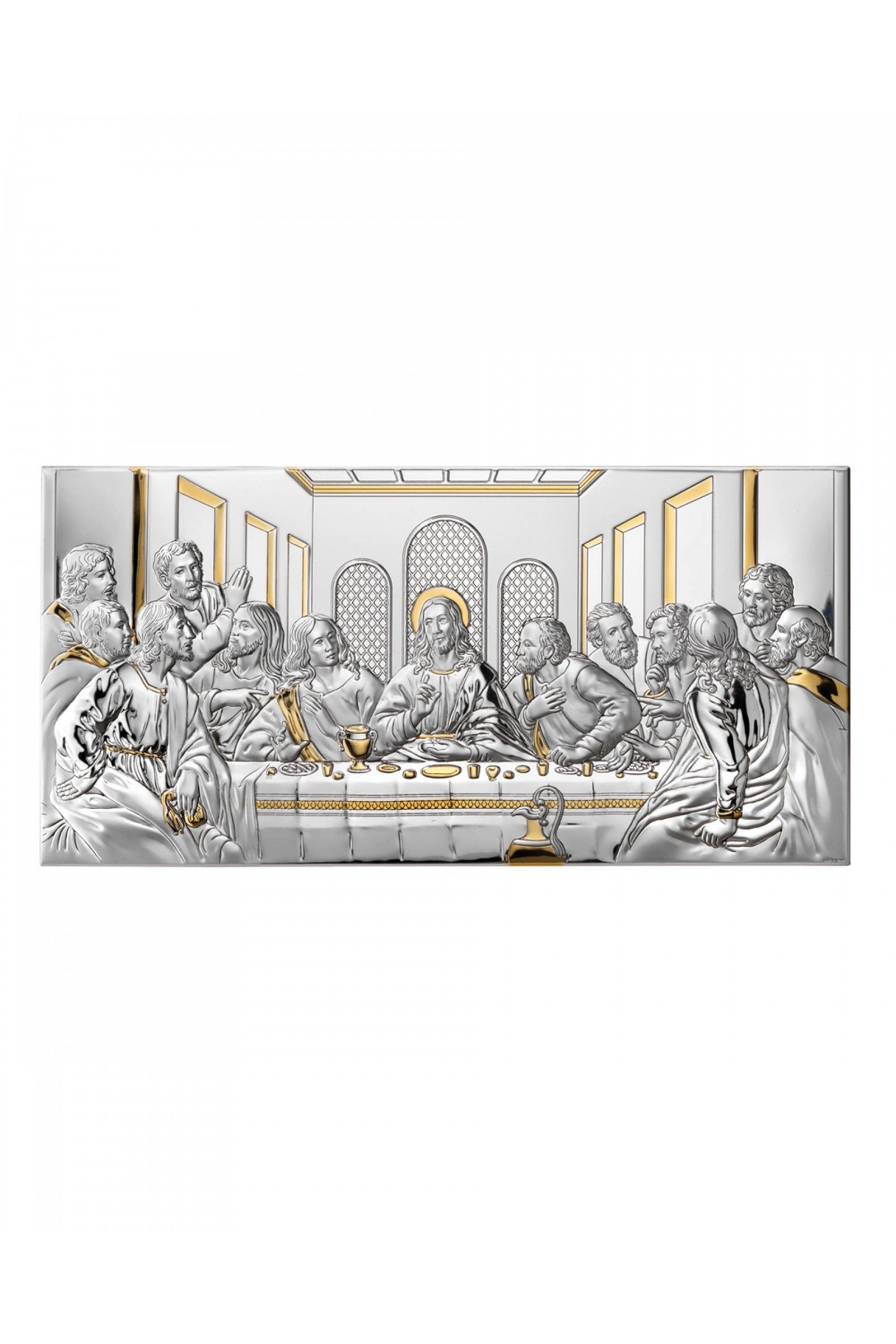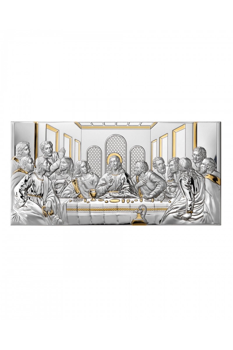 Obrazek z wizerunkiem Pana Jezusa i Apostołów podczas Ostatniej Wieczerzy wykonany metodą płaskorzeźby na srebrnym surowcu. Jest to idealny prezent upamiętniający sakrament Pierwszej Komunii Świętej czy inne ważne duchowe wydarzenia. Produkt posiada elegancką formę, wykonany techniką plateru czyli artystyczny kształt blaszki pokrytej srebrem i złotem z wytłoczonym lub wygrawerowanym wzorem.