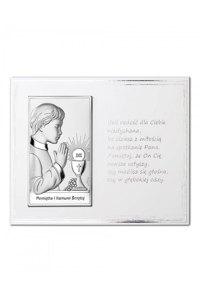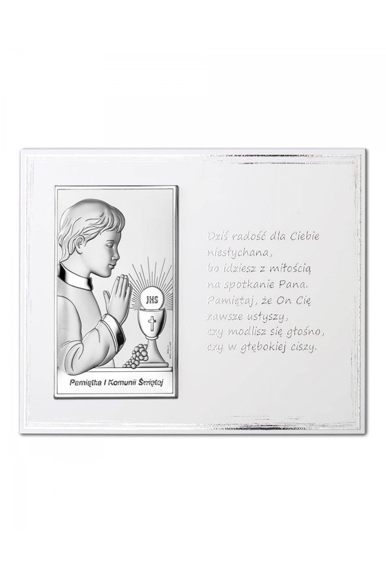Srebrny obrazek z wizerunkiem chłopca - pamiątka wykonana metodą płaskorzeźby na srebrnym surowcu. Jest to idealny prezent upamiętniający sakrament Pierwszej Komunii Świętej. Produkt posiada elegancką formę, wykonany techniką plateru czyli artystyczny kształt blaszki pokrytej srebrem z wytłoczonym lub wygrawerowanym wzorem.