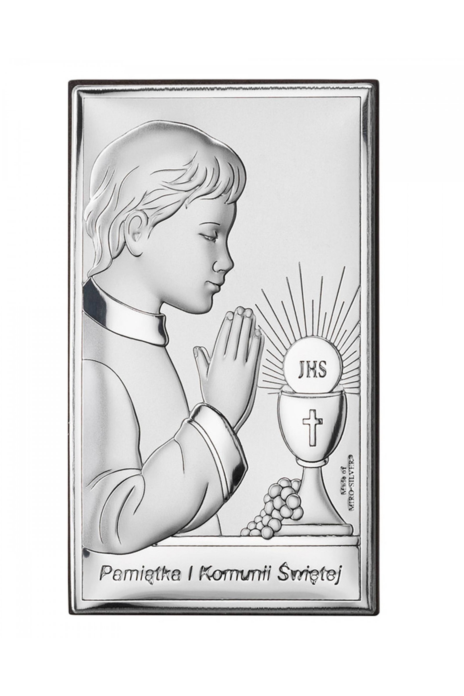 Srebrny obrazek z wizerunkiem chłopca - pamiątka wykonana metodą płaskorzeźby na srebrnym surowcu. Jest to idealny prezent upamiętniający sakrament Pierwszej Komunii Świętej. Produkt posiada elegancką formę, wykonany techniką plateru czyli artystyczny kształt blaszki pokrytej srebrem z wytłoczonym lub wygrawerowanym wzorem.
