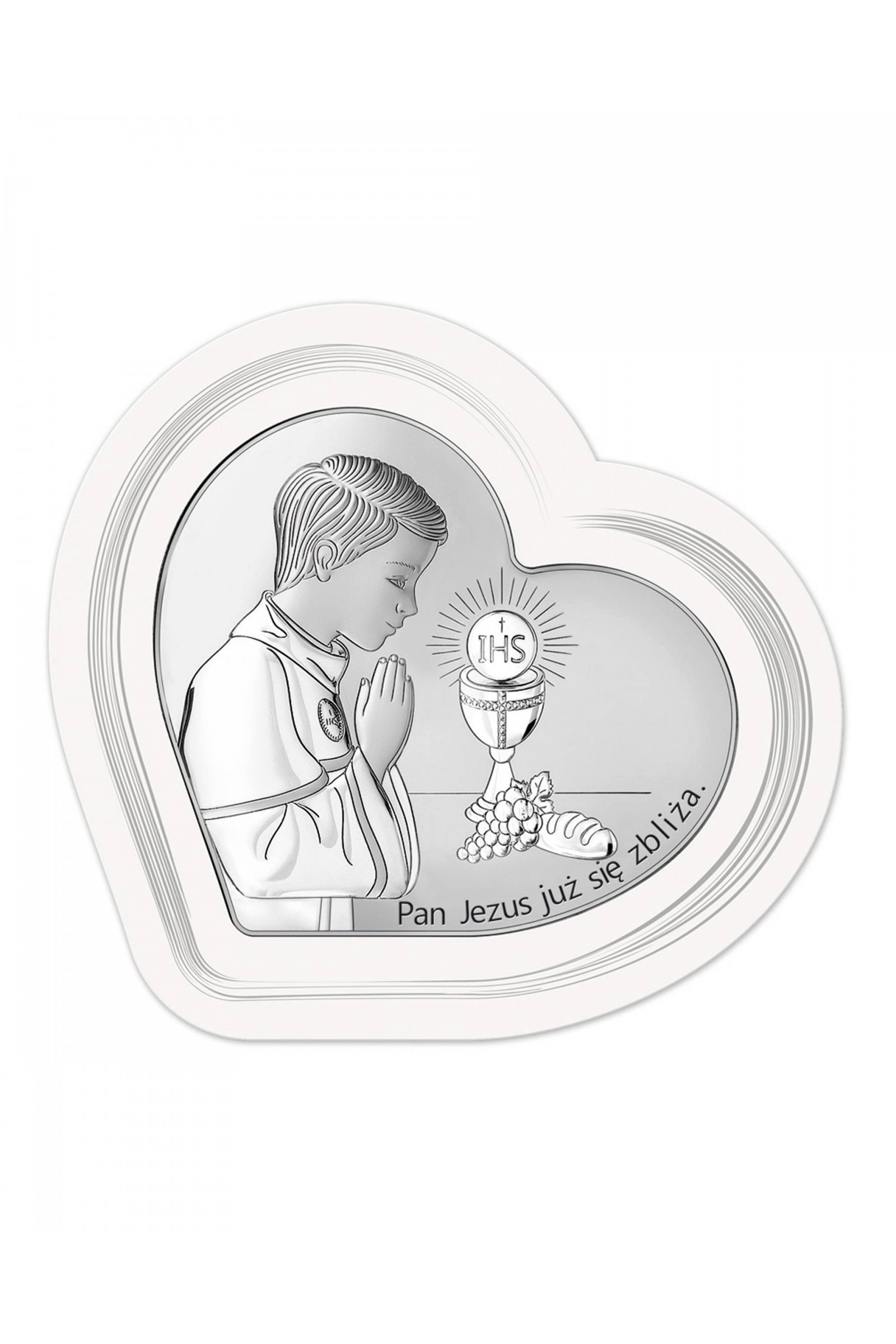 Srebrny obrazek z wizerunkiem chłopca - pamiątka wykonana metodą płaskorzeźby na srebrnym surowcu. Jest to idealny prezent upamiętniający sakrament Pierwszej Komunii Świętej. Produkt posiada elegancką formę, wykonany techniką plateru czyli artystyczny kształt blaszki pokrytej srebrem z wytłoczonym lub wygrawerowanym wzorem.