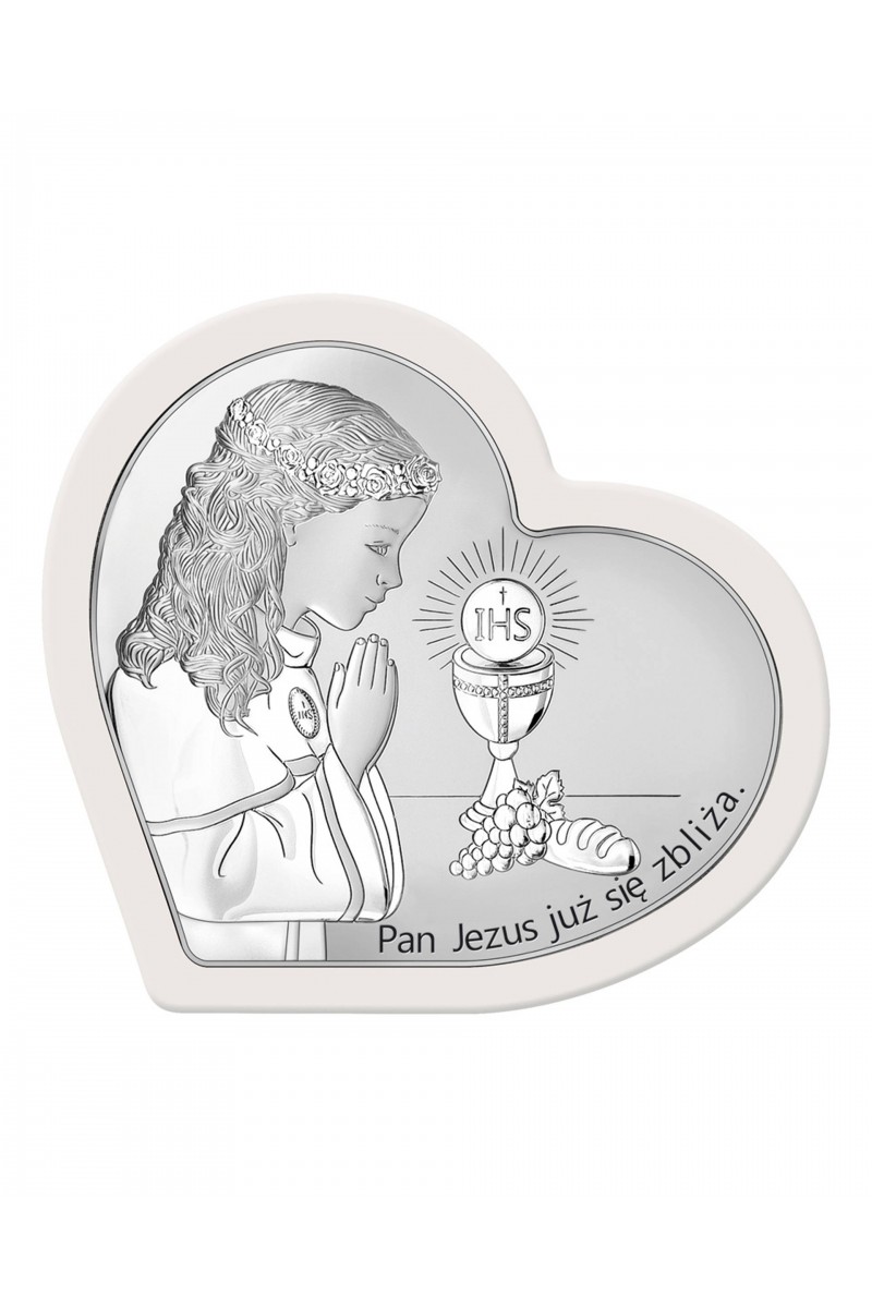 Srebrny obrazek z wizerunkiem dziewczynki - pamiątka wykonana metodą płaskorzeźby na srebrnym surowcu. Jest to idealny prezent upamiętniający sakrament Pierwszej Komunii Świętej. Produkt posiada elegancką formę, wykonany techniką plateru czyli artystyczny kształt blaszki pokrytej srebrem z wytłoczonym lub wygrawerowanym wzorem.
