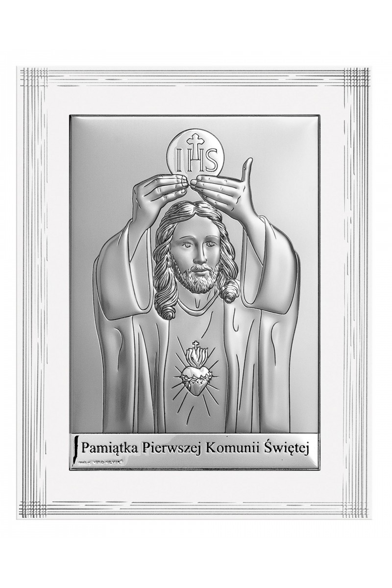 Srebrny obrazek z wizerunkiem Pana Jezusa - pamiątka wykonana metodą płaskorzeźby na srebrnym surowcu. Jest to idealny prezent upamiętniający sakrament Pierwszej Komunii Świętej. Produkt posiada elegancką formę, wykonany techniką plateru czyli artystyczny kształt blaszki pokrytej srebrem z wytłoczonym lub wygrawerowanym wzorem.
