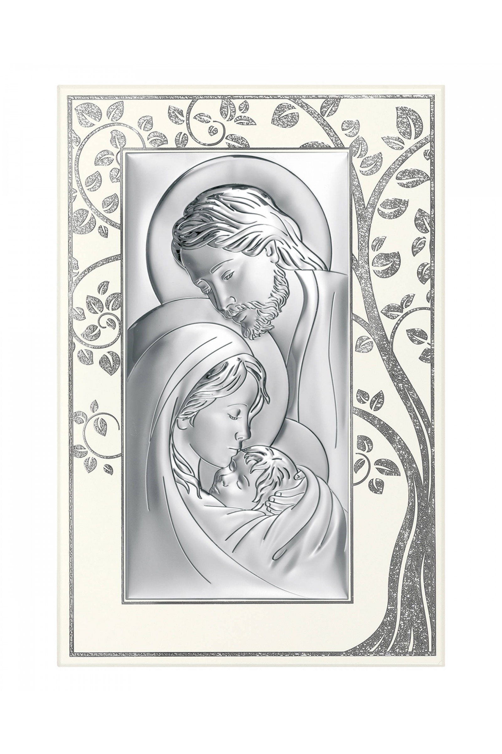 Obrazek Świętej Rodziny wykonany metodą płaskorzeźby na srebrnym surowcu. Jest to idealny prezent upamiętniający sakrament Pierwszej Komunii Świętej czy inne ważne duchowe wydarzenia. Produkt posiada elegancką formę, wykonany techniką plateru czyli artystyczny kształt blaszki pokrytej srebrem z wytłoczonym lub wygrawerowanym wzorem.