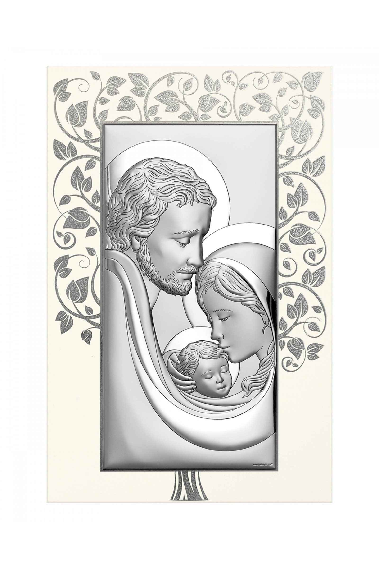 Obrazek Świętej Rodziny wykonany metodą płaskorzeźby na srebrnym surowcu. Jest to idealny prezent upamiętniający sakrament Pierwszej Komunii Świętej czy inne ważne duchowe wydarzenia. Produkt posiada elegancką formę, wykonany techniką plateru czyli artystyczny kształt blaszki pokrytej srebrem z wytłoczonym lub wygrawerowanym wzorem.