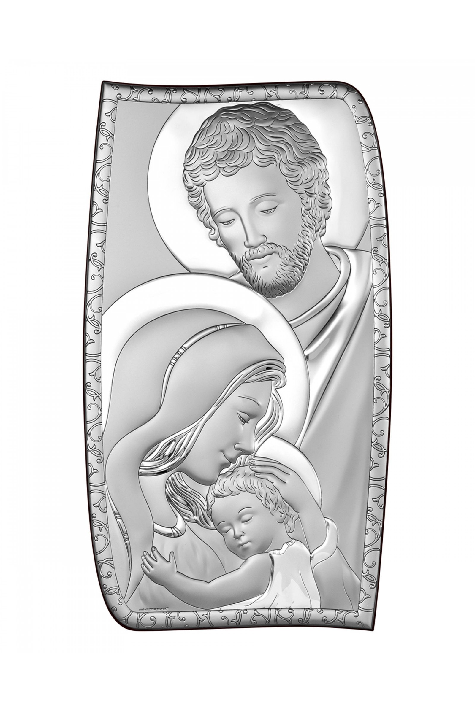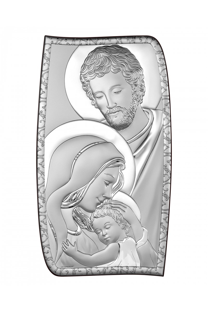 Obrazek Świętej Rodziny wykonany metodą płaskorzeźby na srebrnym surowcu. Jest to idealny prezent upamiętniający sakrament Pierwszej Komunii Świętej czy inne ważne duchowe wydarzenia. Produkt posiada elegancką formę, wykonany techniką plateru czyli artystyczny kształt blaszki pokrytej srebrem z wytłoczonym lub wygrawerowanym wzorem.