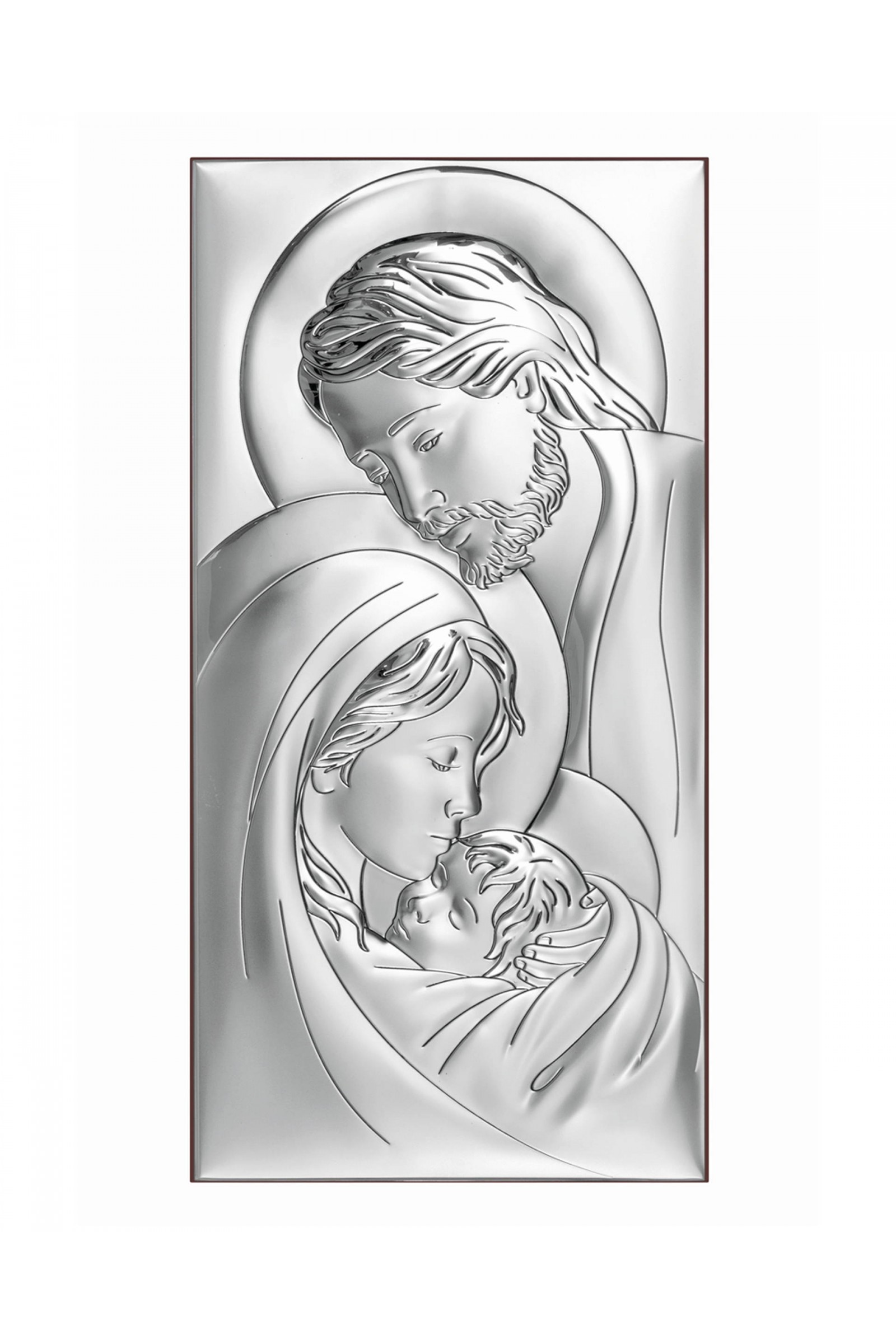 Obrazek Świętej Rodziny wykonany metodą płaskorzeźby na srebrnym surowcu. Jest to idealny prezent upamiętniający sakrament Pierwszej Komunii Świętej czy inne ważne duchowe wydarzenia. Produkt posiada elegancką formę, wykonany techniką plateru czyli artystyczny kształt blaszki pokrytej srebrem z wytłoczonym lub wygrawerowanym wzorem.