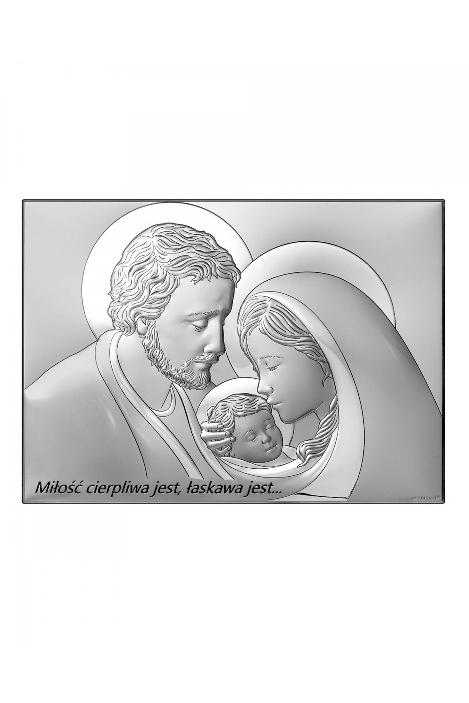 Obrazek Świętej Rodziny wykonany metodą płaskorzeźby na srebrnym surowcu. Jest to idealny prezent upamiętniający sakrament Pierwszej Komunii Świętej czy inne ważne duchowe wydarzenia. Produkt posiada elegancką formę, wykonany techniką plateru czyli artystyczny kształt blaszki pokrytej srebrem z wytłoczonym lub wygrawerowanym wzorem.