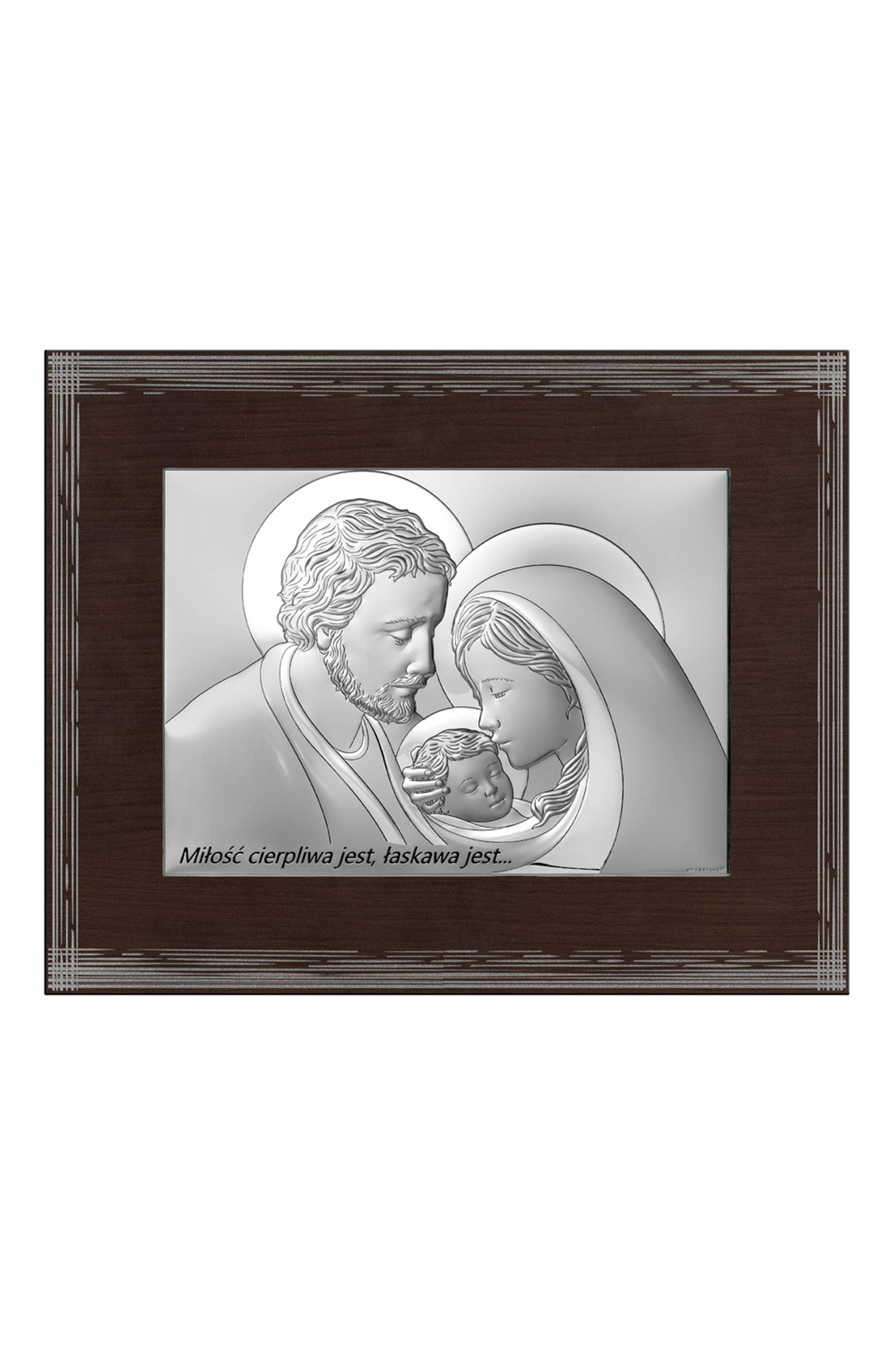 Obrazek Świętej Rodziny wykonany metodą płaskorzeźby na srebrnym surowcu. Jest to idealny prezent upamiętniający sakrament Pierwszej Komunii Świętej czy inne ważne duchowe wydarzenia. Produkt posiada elegancką formę, wykonany techniką plateru czyli artystyczny kształt blaszki pokrytej srebrem z wytłoczonym lub wygrawerowanym wzorem.