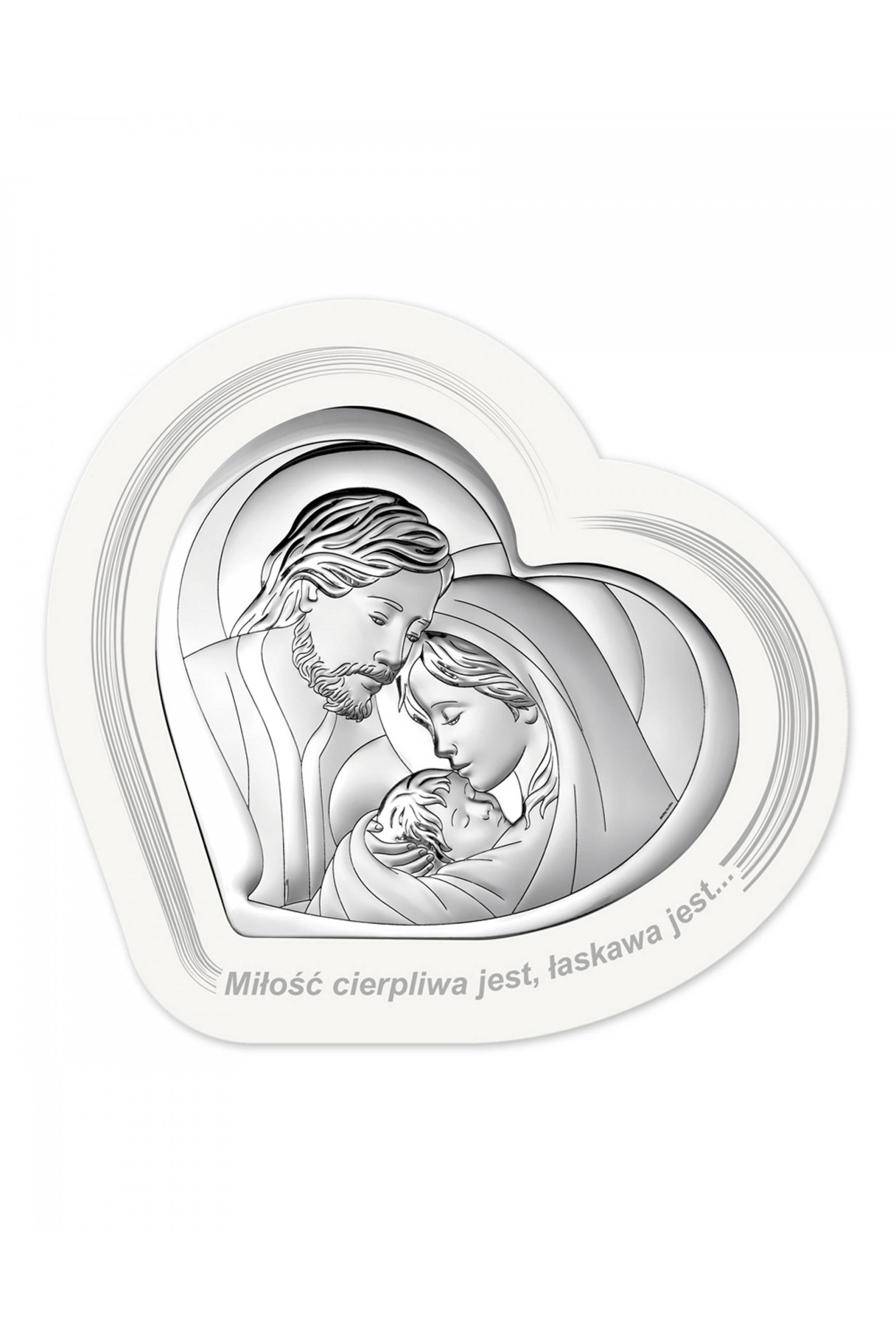 Obrazek Świętej Rodziny wykonany metodą płaskorzeźby na srebrnym surowcu. Jest to idealny prezent upamiętniający sakrament Pierwszej Komunii Świętej czy inne ważne duchowe wydarzenia. Produkt posiada elegancką formę, wykonany techniką plateru czyli artystyczny kształt blaszki pokrytej srebrem z wytłoczonym lub wygrawerowanym wzorem.