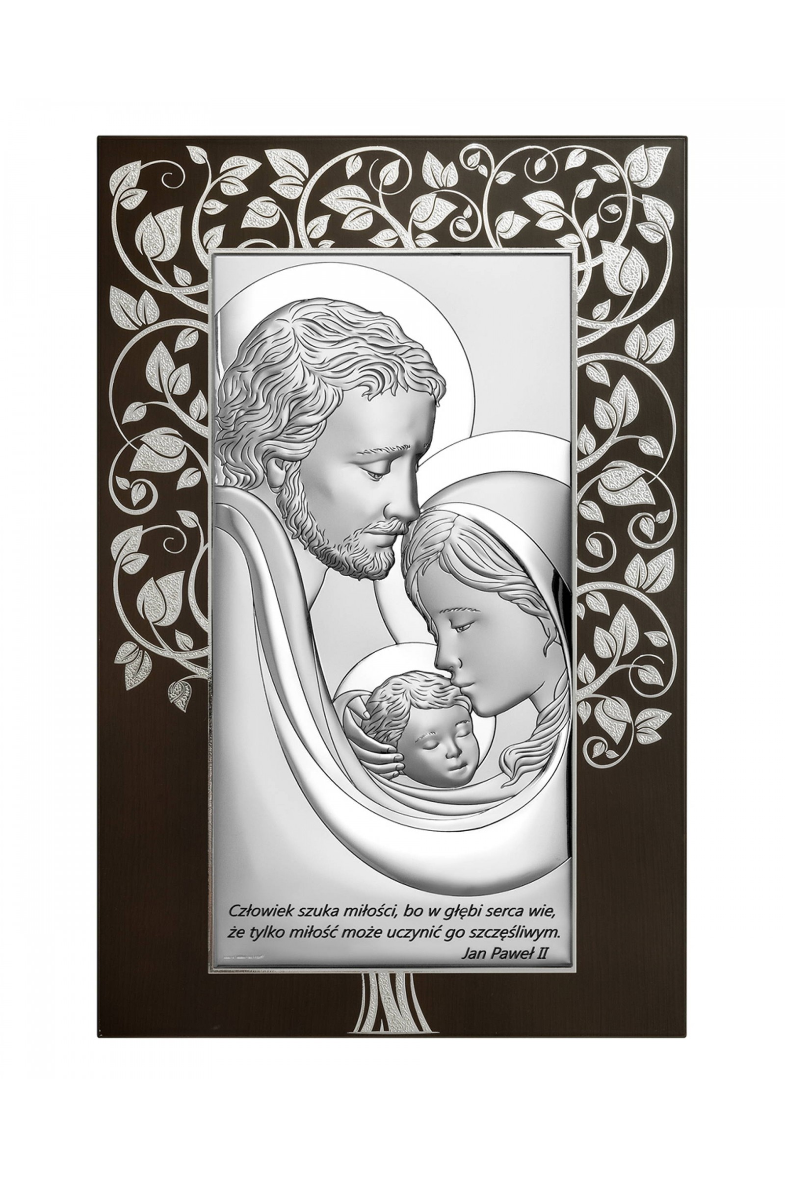Obrazek Świętej Rodziny wykonany metodą płaskorzeźby na srebrnym surowcu. Jest to idealny prezent upamiętniający sakrament Pierwszej Komunii Świętej czy inne ważne duchowe wydarzenia. Produkt posiada elegancką formę, wykonany techniką plateru czyli artystyczny kształt blaszki pokrytej srebrem z wytłoczonym lub wygrawerowanym wzorem.