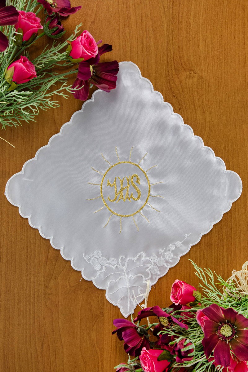 Chusteczka komunijna haftowana uszyta z atłasu, będzie doskonałym pomysłem na upominek i drobiazg dzięki, któremu dzień I Komunii Świętej na zawsze zapamięta Państwa dziecko. Pamiątka komunijna dla chłopca i dziewczynki z kolekcji: Chusteczki komunijne haftowane.