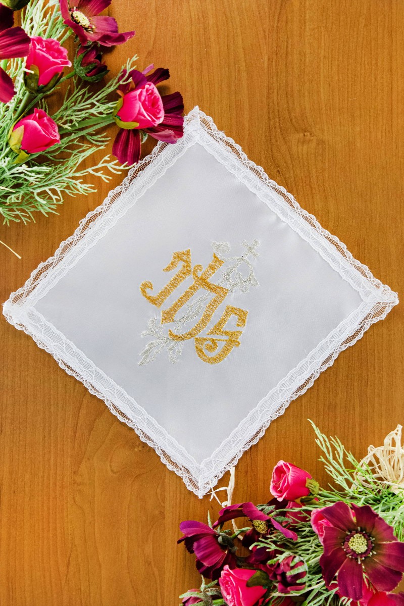 Chusteczka komunijna haftowana uszyta z atłasu, będzie doskonałym pomysłem na upominek i drobiazg dzięki, któremu dzień I Komunii Świętej na zawsze zapamięta Państwa dziecko. Pamiątka komunijna dla chłopca i dziewczynki z kolekcji: Chusteczki komunijne haftowane.
