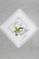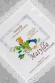 Chusteczka z połyskiem obszyta koronką, wykonana w technice grafiki na tkaninie. Jest na niej wydrukowana treść z personalizacją czyli imię i nazwisko dziecka oraz parafia, w której miała miejsce uroczystość Sakramentu I Komunii Świętej. Posiada sekwencję pierwszokomunijną podkreślającą wyjątkowość uroczystości. Pamiątka komunijna dla chłopca i dziewczynki z kolekcji: Chusteczki komunijne z grafiką spersonalizowane.