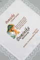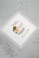 Chusteczka z połyskiem obszyta koronką, wykonana w technice grafiki na tkaninie. Jest na niej wydrukowana treść z personalizacją czyli imię i nazwisko dziecka oraz parafia, w której miała miejsce uroczystość Sakramentu I Komunii Świętej. Posiada sekwencję pierwszokomunijną podkreślającą wyjątkowość uroczystości. Pamiątka komunijna dla chłopca i dziewczynki z kolekcji: Chusteczki komunijne z grafiką spersonalizowane.