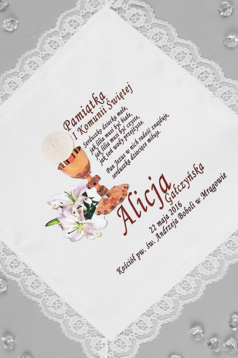 Chusteczka z połyskiem obszyta koronką, wykonana w technice grafiki na tkaninie. Jest na niej wydrukowana treść z personalizacją czyli imię i nazwisko dziecka oraz parafia, w której miała miejsce uroczystość Sakramentu I Komunii Świętej. Posiada sekwencję pierwszokomunijną podkreślającą wyjątkowość uroczystości. Pamiątka komunijna dla chłopca i dziewczynki z kolekcji: Chusteczki komunijne z grafiką spersonalizowane.