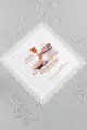 Chusteczka z połyskiem obszyta koronką, wykonana w technice grafiki na tkaninie. Jest na niej wydrukowana treść z personalizacją czyli imię i nazwisko dziecka oraz parafia, w której miała miejsce uroczystość Sakramentu I Komunii Świętej. Posiada sekwencję pierwszokomunijną podkreślającą wyjątkowość uroczystości. Pamiątka komunijna dla chłopca i dziewczynki z kolekcji: Chusteczki komunijne z grafiką spersonalizowane.