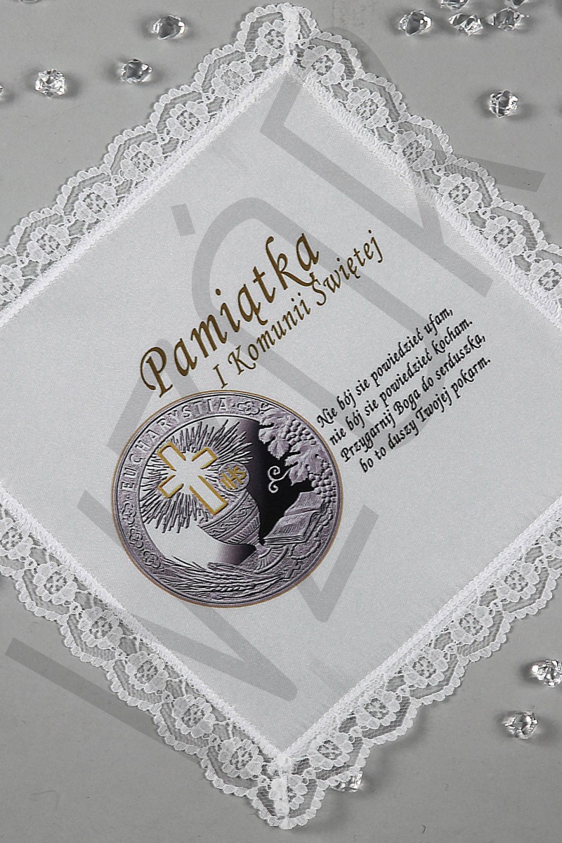 Wyjątkowa Pamiątka I Komunii Św. w postaci chusteczki wykonanej w technice grafiki na tkaninie z połyskiem obszyta koronką. Posiada sekwencję pierwszokomunijną podkreślającą wyjątkowość uroczystości. Pamiątka komunijna dla chłopca i dziewczynki z kolekcji: Chusteczki komunijne z grafiką bez personalizacji.