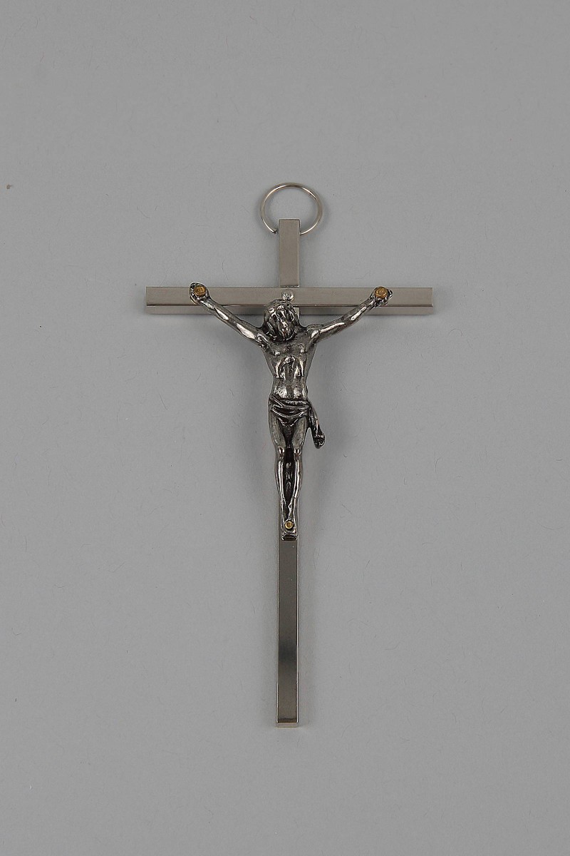 Krzyż pierwszokomunijny wiszący, wykonany z niklu, mosiądzu i drewna z zamieszczonym wizerunkiem Jezusa Chrystusa. Starannie wykonany, Polskiej produkcji o najwyższej jakości. Jest to nieodłączny dodatek dla dzieci przystępujących do Pierwszej Komunii Świętej z kategorii: Krzyże, pamiątki komunijne.