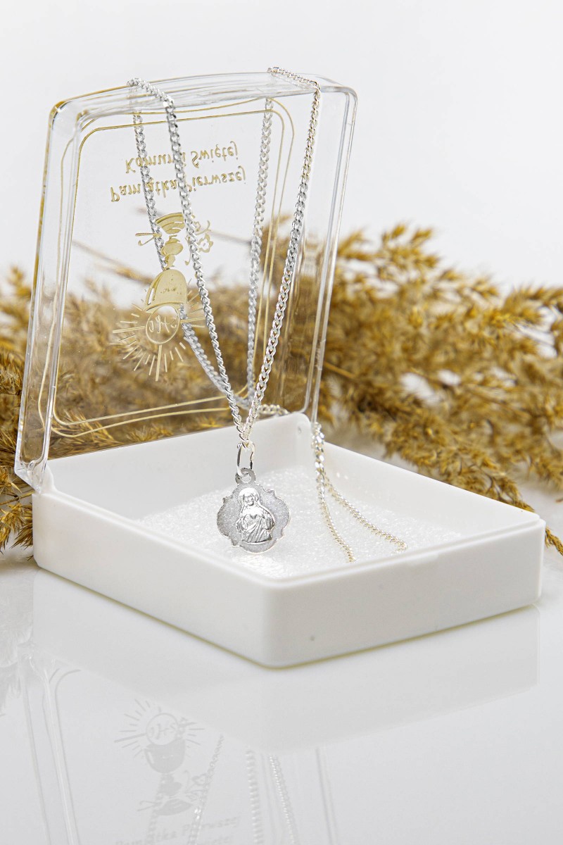 Łańcuszek z medalikiem lub krzyżykiem to idealna pamiątka z okazji przystąpienia przez dziecko do Pierwszej Komunii Świętej, jest to obowiązkowy element stroju komunijnego chłopca lub dziewczynki. Najwyższej klasy srebro i wysoka jakość wykonania to gwarancja, że komplet będzie pamiątką na długie lata. W skład zestawu wchodzi także eleganckie pudełeczko. Produkt z serii: Medaliki komunijne.