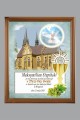 Klient otrzymuje spersonalizowaną pamiątkę z wydrukowanym imieniem i nazwiskiem dziecka oraz datą Pierwszej Komunii Świętej w zestawie z drewnianą ramką i szybką.