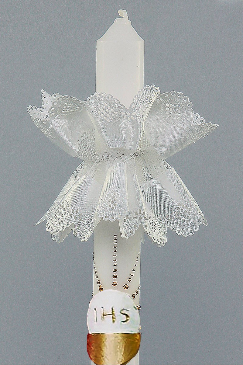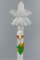 Okapnik komunijny jest praktycznym i estetycznym dodatkiem – z jednej strony zapobiega przed ewentualnym kapaniem wosku, a z drugiej upiększa trzymaną przez dziecko świece. Produkt z kategorii: Okapniki komunijne na świece.