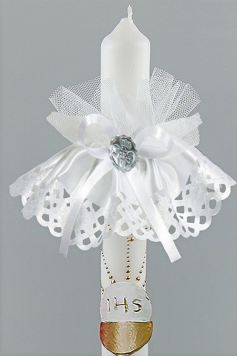 Okapnik komunijny jest praktycznym i estetycznym dodatkiem – z jednej strony zapobiega przed ewentualnym kapaniem wosku, a z drugiej upiększa trzymaną przez dziecko świece. Produkt z kategorii: Okapniki komunijne na świece.