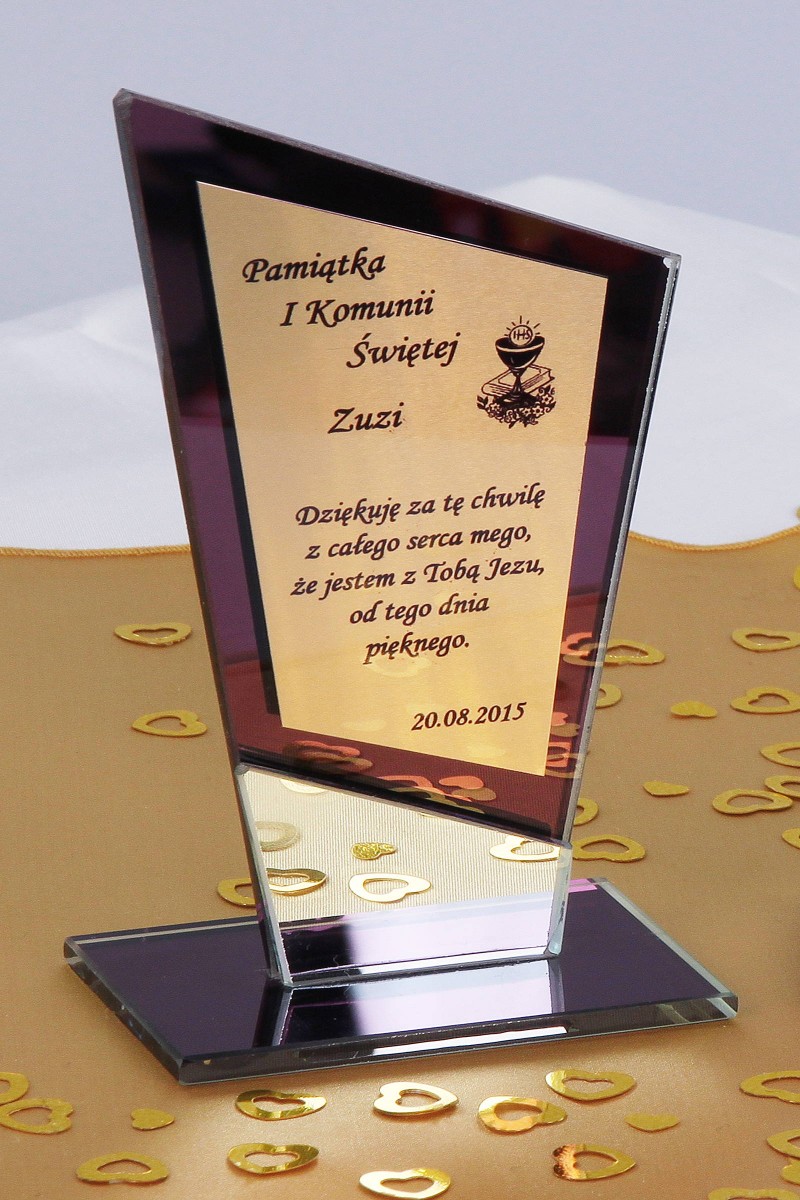 Ciekawym pomysłem na atrakcyjny prezent lub miła niespodzianka przygotowana dla dziecka z okazji przyjęcia Sakramentu Pierwszej Komunii Świętej jest ZŁOTA Pamiątka na I komunię Św. - statuetka wykonana z kolorowego szkła z grawerem.