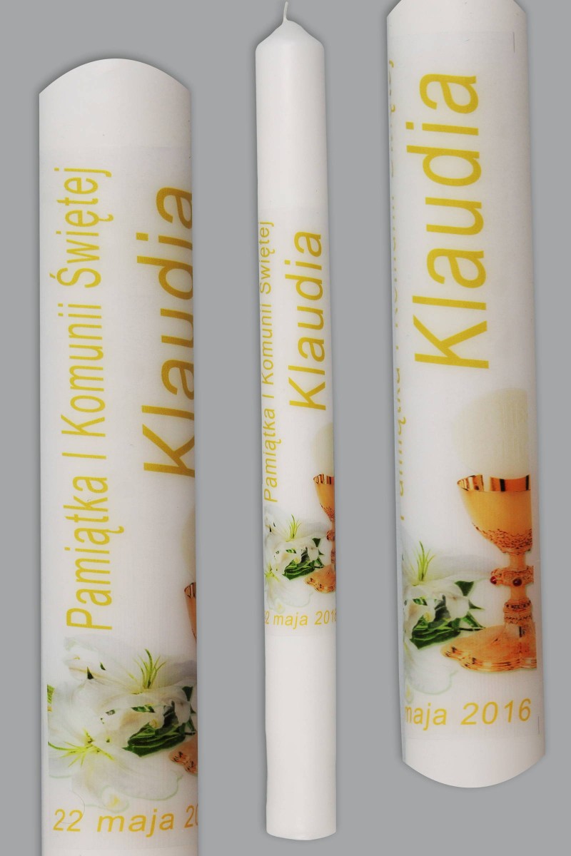 Świeca komunijna wykonana w Polsce, do jej produkcji użyto wosku o bardzo wysokiej jakości. Elegancka pamiątka z okazji przyjęcia Sakramentu Pierwszej Komunii Świętej. Artykuł z kategorii: Świece komunijne.