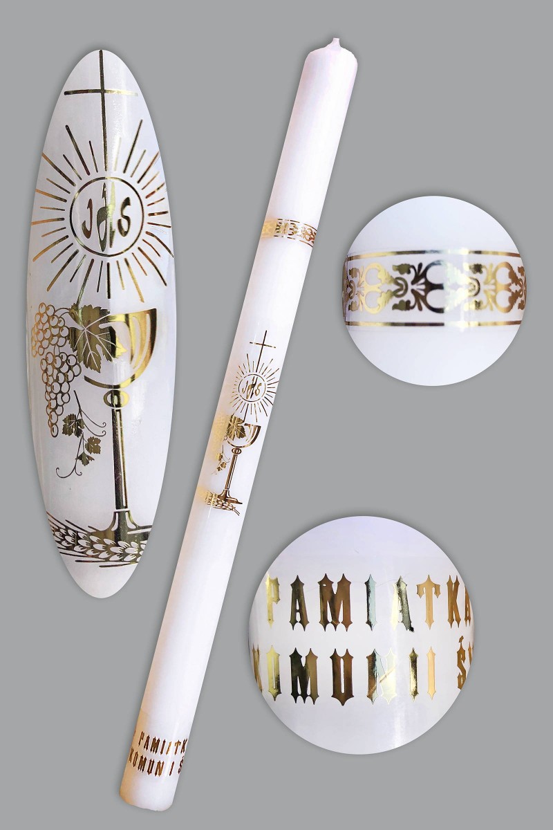 Świeca komunijna wykonana w Polsce, do jej produkcji użyto wosku o bardzo wysokiej jakości. Elegancka pamiątka z okazji przyjęcia Sakramentu Pierwszej Komunii Świętej. Artykuł z kategorii: Świece komunijne.