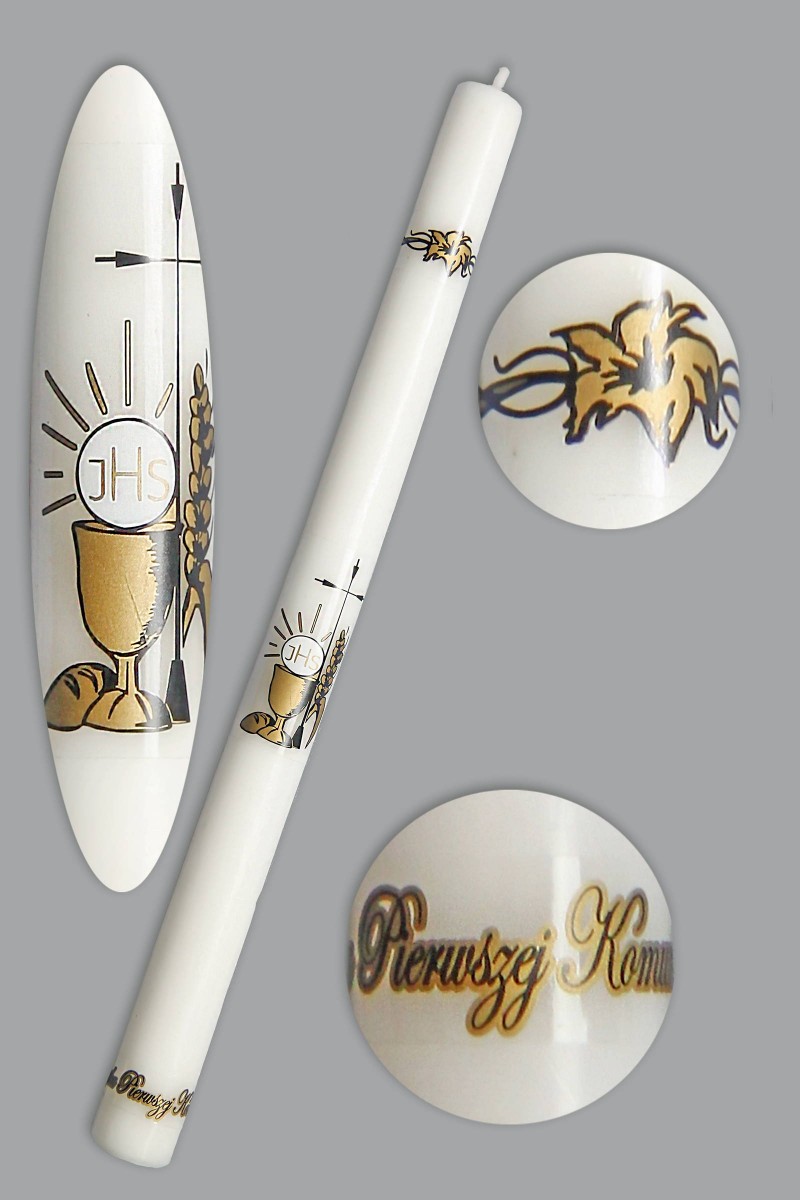 Świeca komunijna wykonana w Polsce, do jej produkcji użyto wosku o bardzo wysokiej jakości. Elegancka pamiątka z okazji przyjęcia Sakramentu Pierwszej Komunii Świętej. Artykuł z kategorii: Świece komunijne.