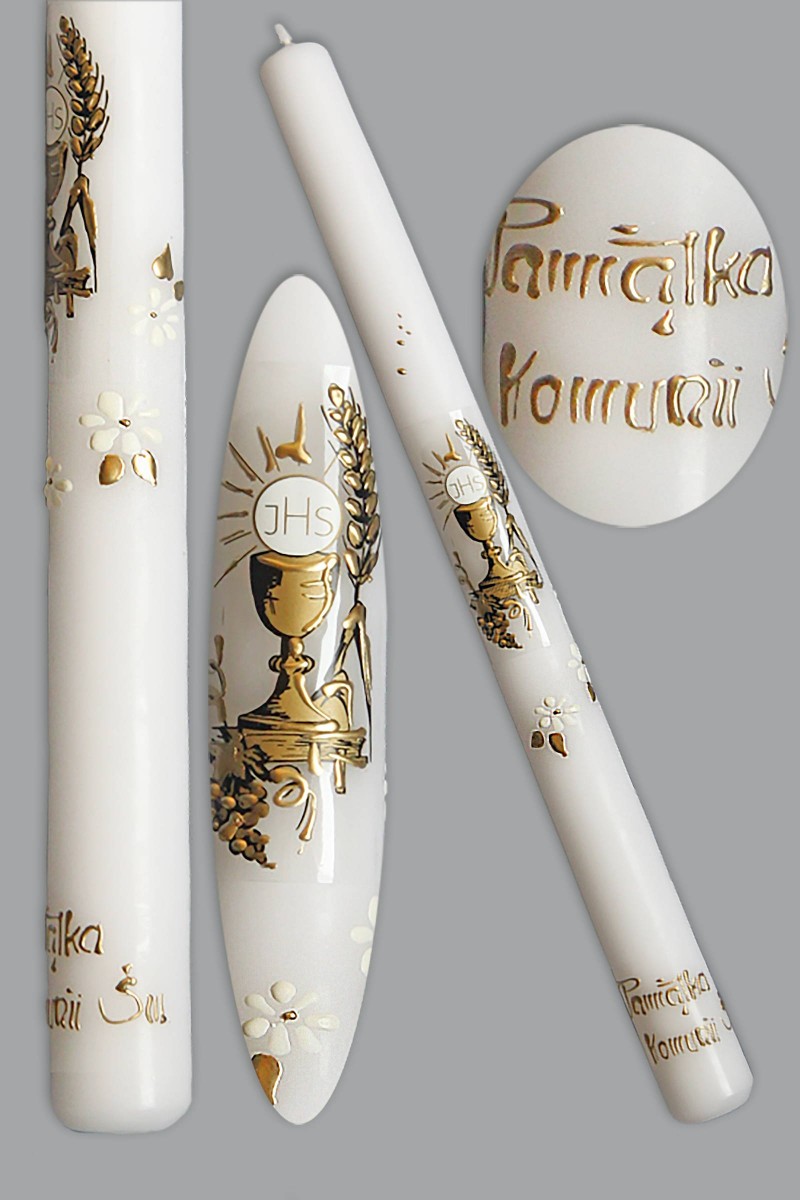 Świeca komunijna wykonana w Polsce, do jej produkcji użyto wosku o bardzo wysokiej jakości. Elegancka pamiątka z okazji przyjęcia Sakramentu Pierwszej Komunii Świętej. Artykuł z kategorii: Świece komunijne.