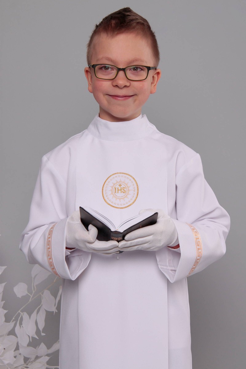 Strój na fotografii należy do kategorii: Ubiory komunijne dla chłopców. Model prezentuje albę z serii: Alby komunijne krótkie.