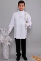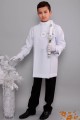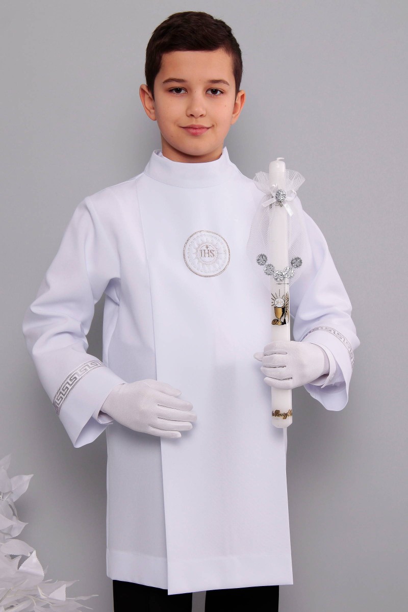 Strój na fotografii należy do kategorii: Ubiory komunijne dla chłopców. Model prezentuje albę z serii: Alby komunijne krótkie.