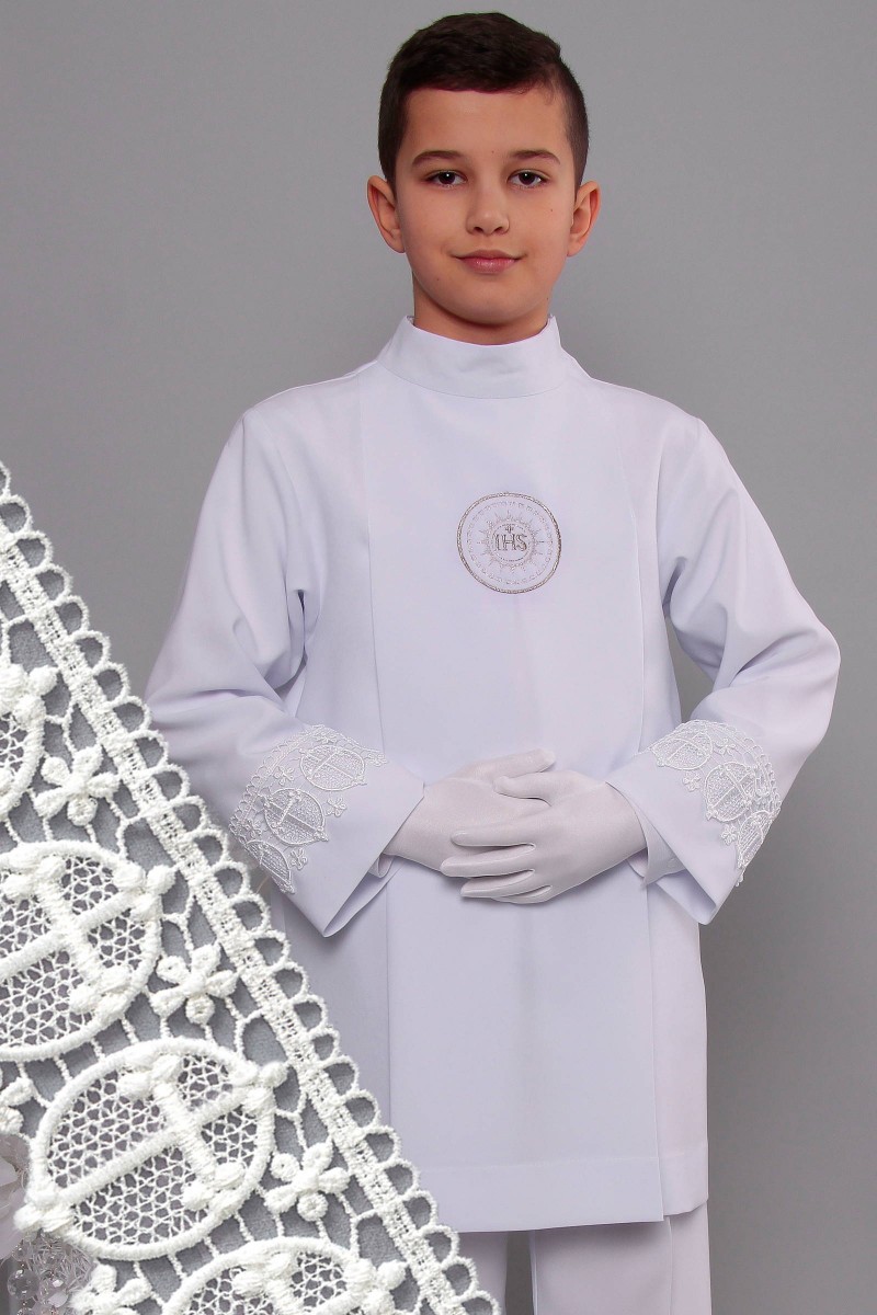Strój na fotografii należy do kategorii: Ubiory komunijne dla chłopców. Model prezentuje albę z serii: Alby komunijne krótkie.