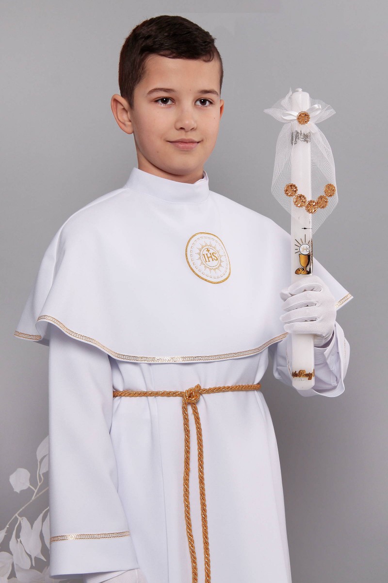 Strój na fotografii należy do kategorii: Ubiory komunijne dla chłopców. Model prezentuje albę z serii: Alby komunijne z karczkiem i kontrafałdą.