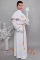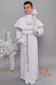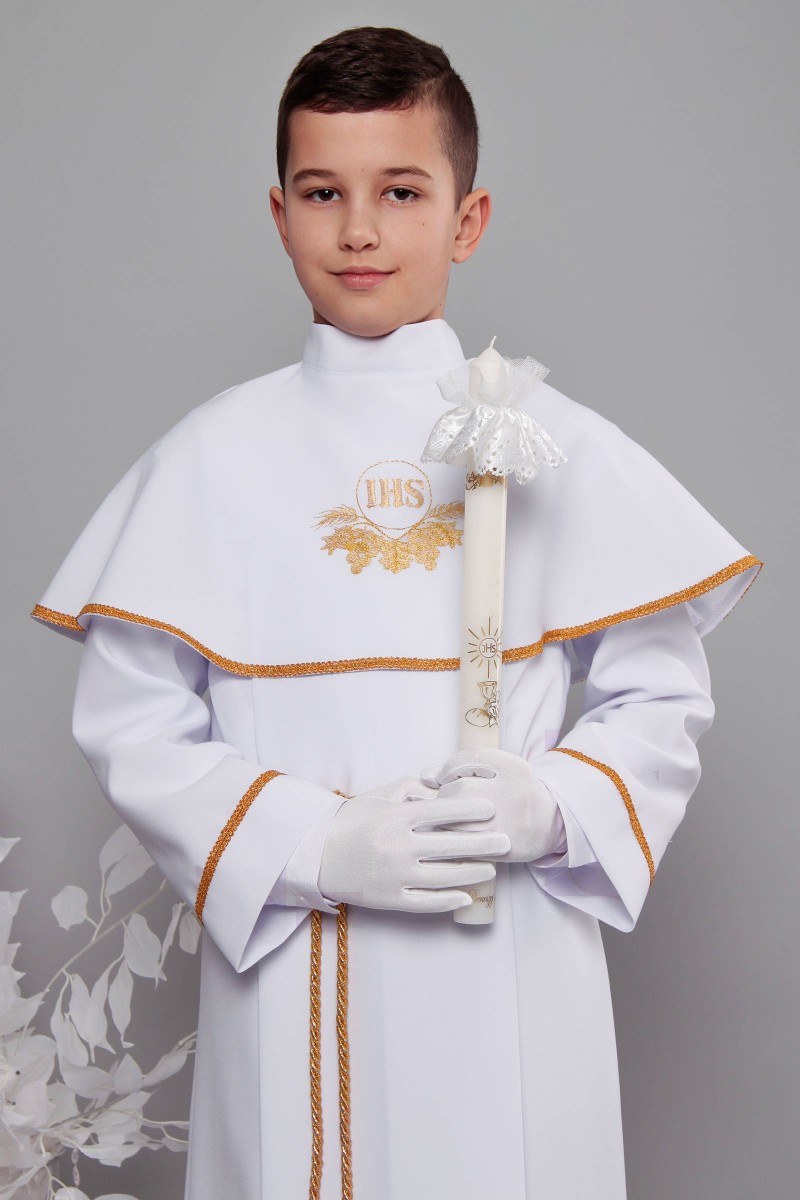 • Klasyczna alba komunijna z karczkiem i kontrafałdą ozdobiona złotym HATEM (wzór IHS) umieszczonym na kołnierzu przeznaczona dla dziewczynek jak i dla chłopców