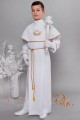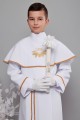 Strój na fotografii należy do kategorii: Ubiory komunijne dla chłopców. Model prezentuje albę z serii: Alby komunijne z karczkiem i kontrafałdą.