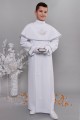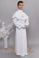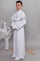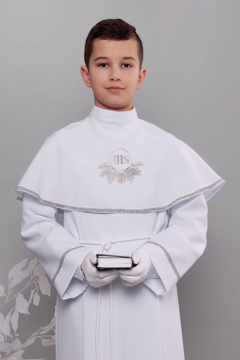 Klasyczna alba komunijna z karczkiem i kontrafałdą ozdobiona srebrnym HATEM (wzór IHS) umieszczonym na kołnierzu przeznaczona dla dziewczynek jak i dla chłopców