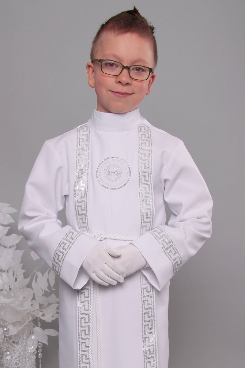 Strój na fotografii należy do kategorii: Ubiory komunijne dla chłopców. Model prezentuje albę z serii: Alby komunijne z kontrafałdą.