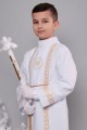 Strój na fotografii należy do kategorii: Ubiory komunijne dla chłopców. Model prezentuje albę z serii: Alby komunijne z kontrafałdą.