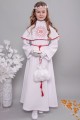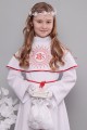 Strój na fotografii należy do kategorii: Ubiory komunijne dla dziewczynek. Modelka prezentuje albę z serii: Alby komunijne rozszerzane.