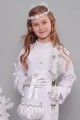 Strój na fotografii należy do kategorii: Ubiory komunijne dla dziewczynek. Modelka prezentuje albę z serii: Alby komunijne z kontrafałdą.