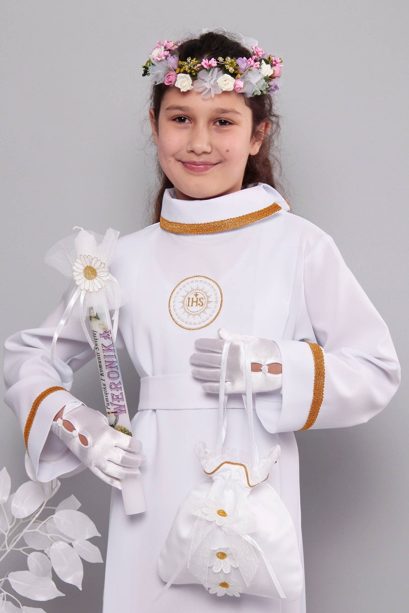 Klasyczna alba komunijna z zakładką od ramienia dla dziewczynek i dla chłopców
