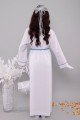 Strój na fotografii należy do kategorii: Ubiory komunijne dla dziewczynek. Modelka prezentuje albę z serii: Alby komunijne z zakładką.