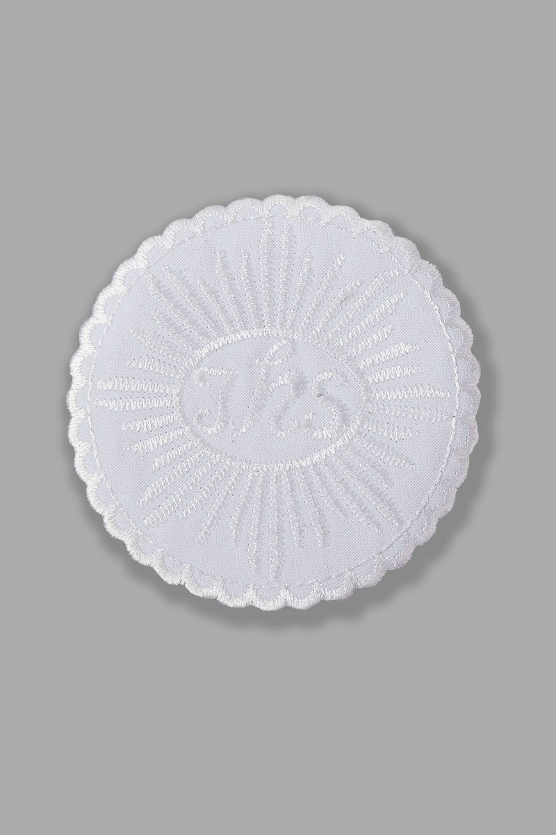Haftowany emblemat jest bardzo ważnym elementem dekoracji alb komunijnych lub dodatków takich jak torebki pierwszokomunijne lub okapniki na świece. Zdjęcie przedstawia artykuł z kategorii: Hostie komunijne, naszywki na albę dla dziewczynek i chłopców.