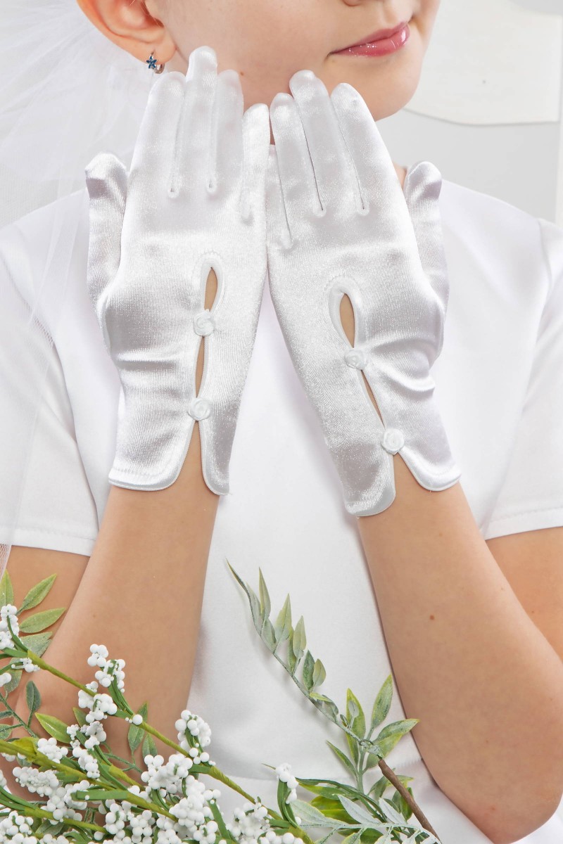 Artykuł z naszej oferty na fotografii należy do kategorii: Akcesoria - Dodatki komunijne dla dziewczynek. Modelka prezentuje rękawiczki komunijne należące do serii: Rękawiczki komunijne klasyczne.